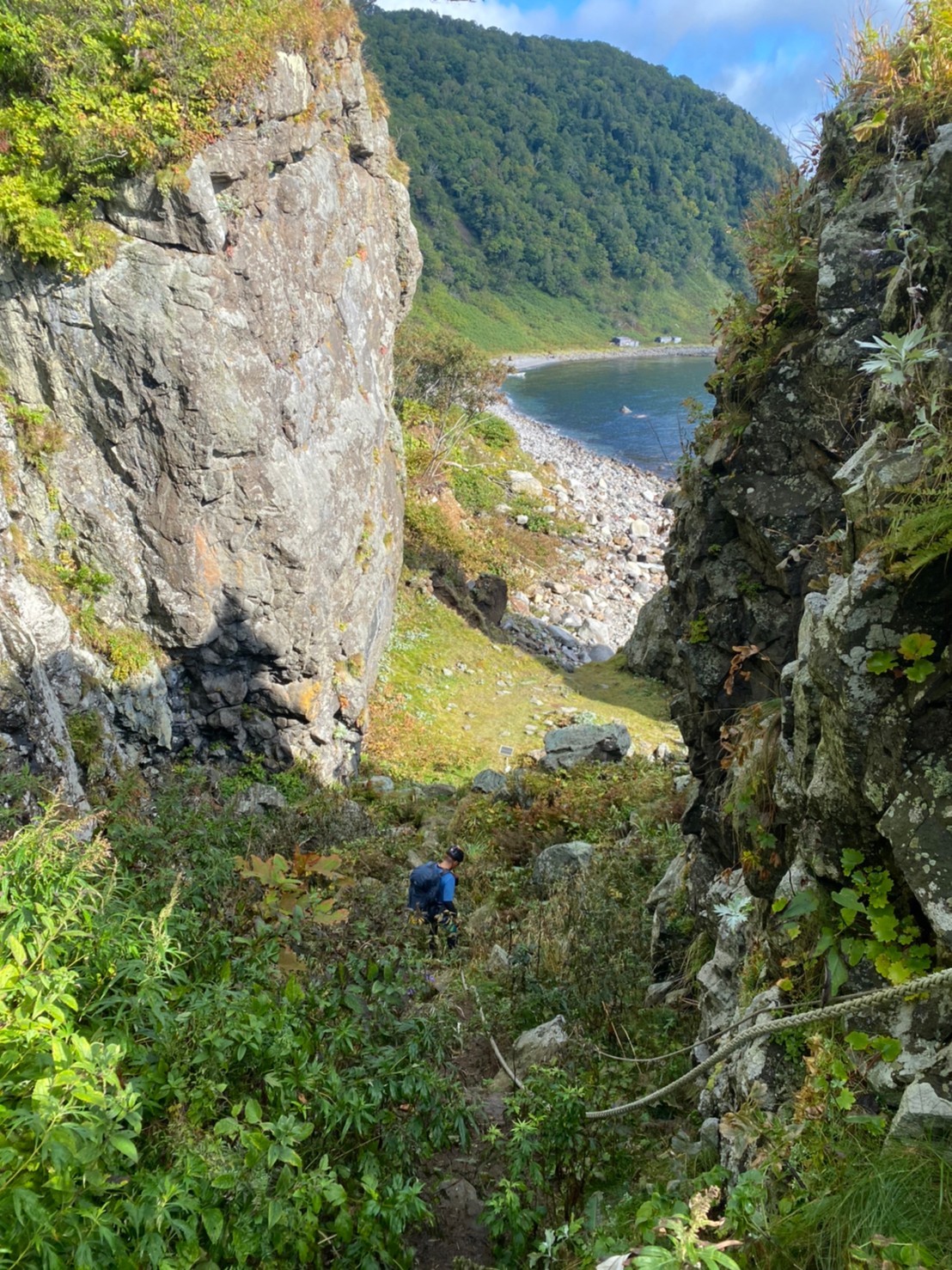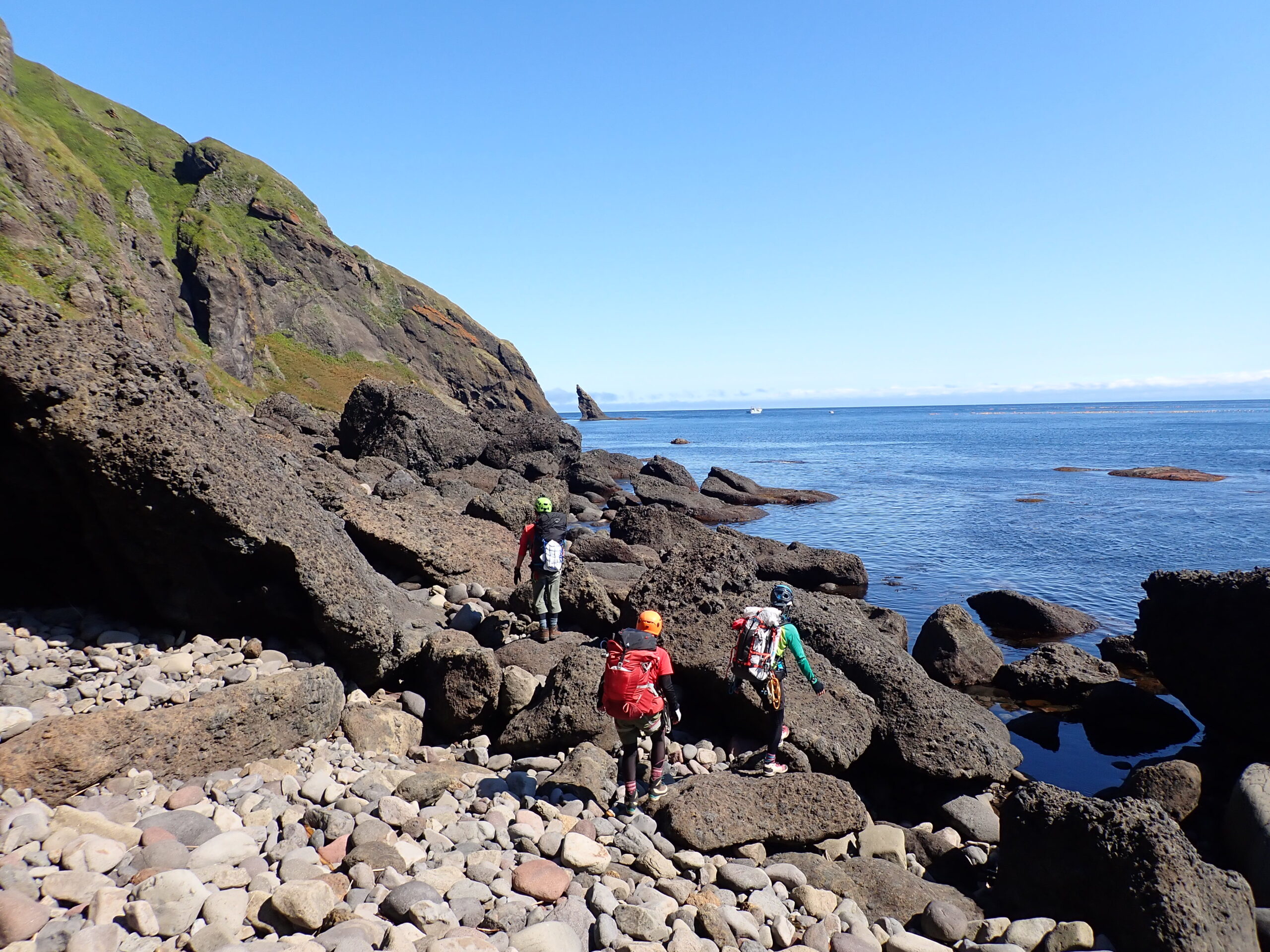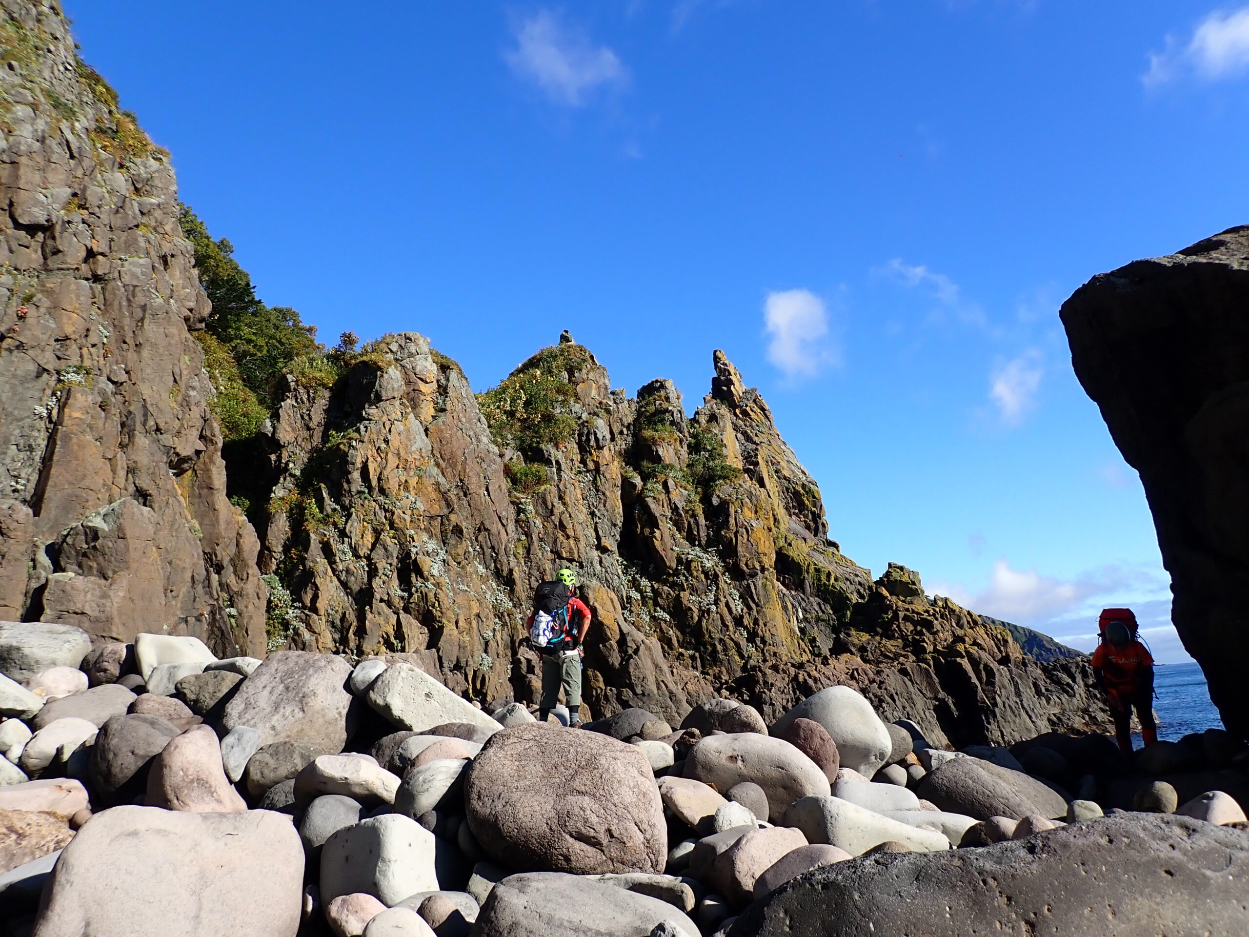 剣岩を越え、メガネ岩の洞窟で登山靴に履き替え、へつりを繰り返すと、ペキンノ鼻が見えてきます。