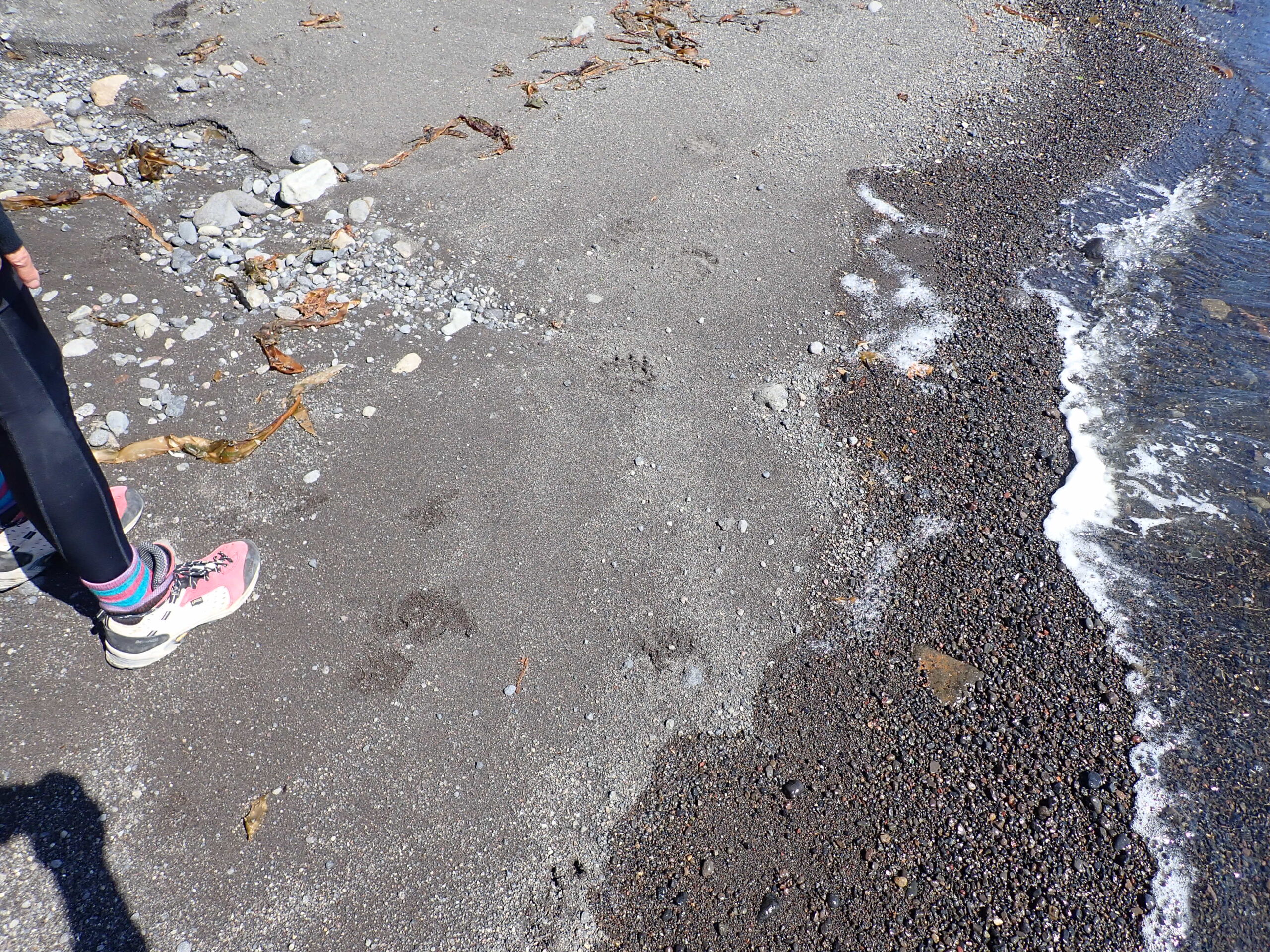カラフトマスを咥えたキタキツネや無数のヒグマの足跡。