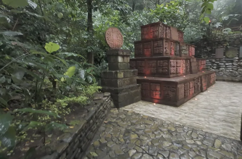 内部には深い竪穴(何かを説明してくれていたけど、祈りがどうとかしか分からんかった)や、内部で発掘された掘り込みの細かい石碑を見せてくれた。