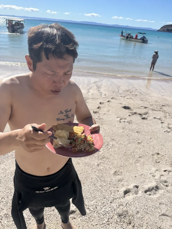このビーチに上陸してランチを食べます。ランチはセビーチェで激ウマでした。