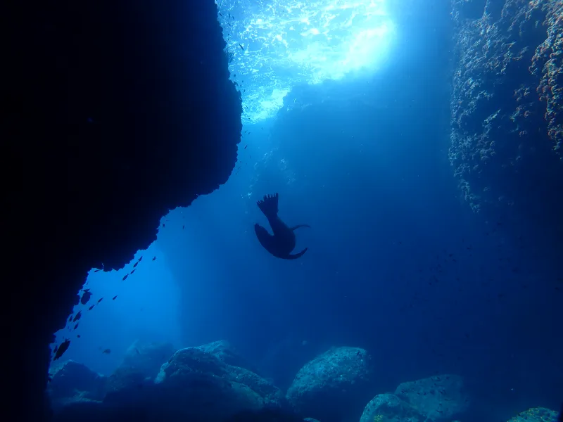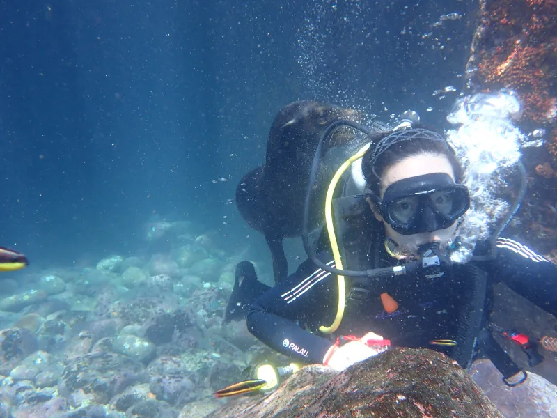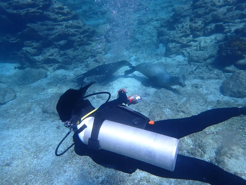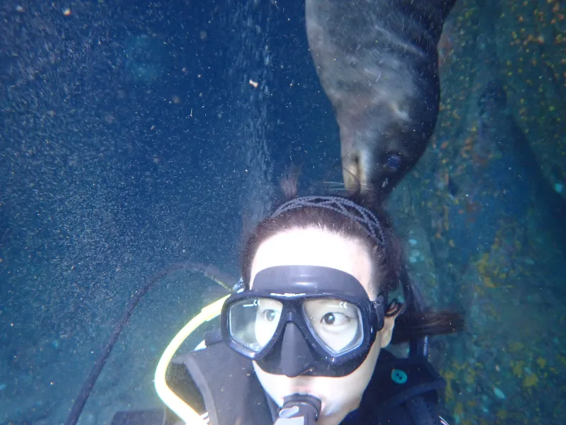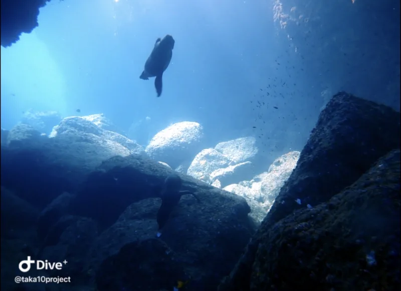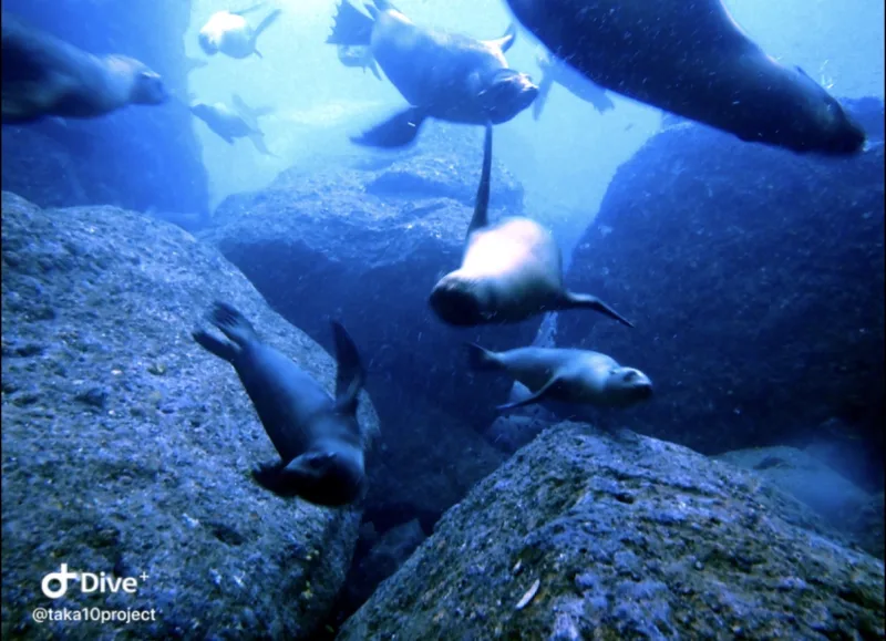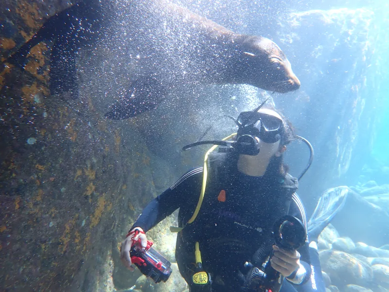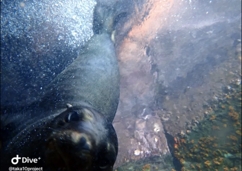 二本目は、アシカダイビングです。潜ってすぐにアシカが寄ってきます。甘噛みしてきます。じゃれてきます。めちゃくちゃかわいいです。
